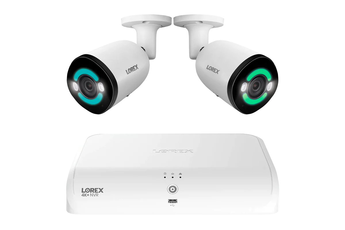 Fusion 4K+ Wired NVR System with 2 TB storage and choice of 2, 4, 6, or 8 12 MP H30 smart bullet cameras. Offers smart lighting, color night vision, two-way audio, and expandable surveillance—no subscription needed.
