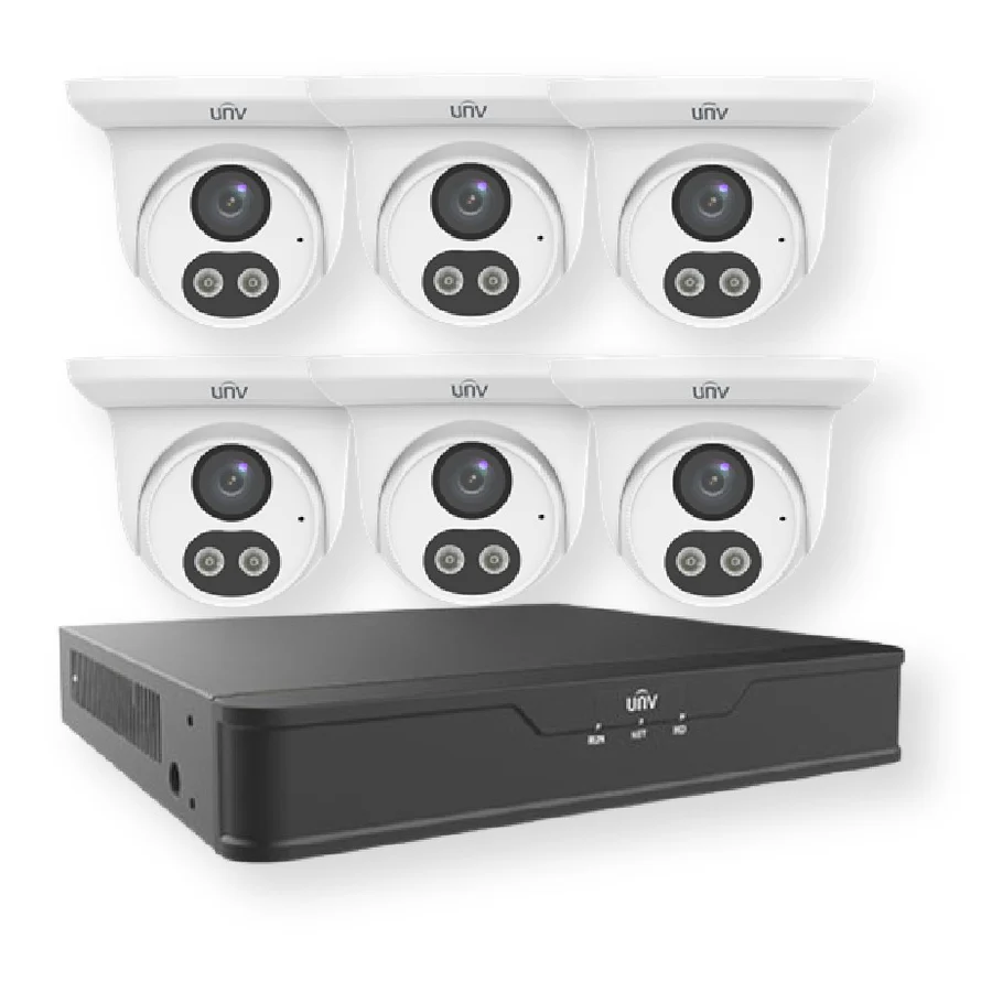 The Uniview 8-Channel 4MP PoE Turret Camera Surveillance Kit offers a comprehensive solution for monitoring residential or commercial properties. This package includes six 4MP turret cameras (model EC-T4F28M-V3) delivering crisp 2560×1440 resolution at up to 25 frames per second. Each camera is equipped with Smart IR technology, providing clear night vision up to 30 meters (98 feet), and features a wide 107.5° field of view for extensive area coverage.